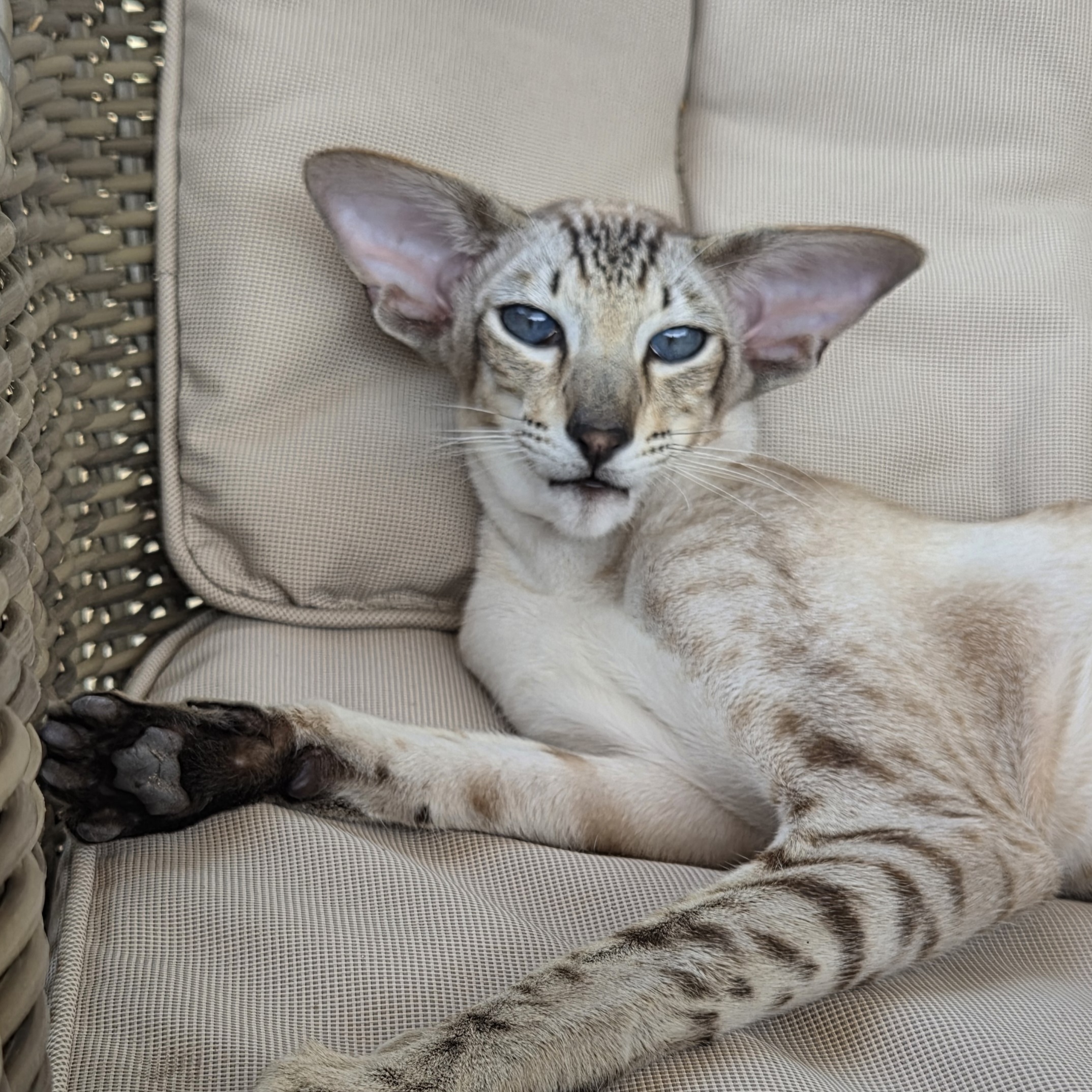 We are excited to introduce Stripe, our own bred future stud boy. He has no inbreeding and will provide a good outcross for all of our girls. Stripe will be for our own breeding only, and will be at closed stud for the foreseeable future. Stripe carries dilute and also classic/blotched oriental tabby pattern.